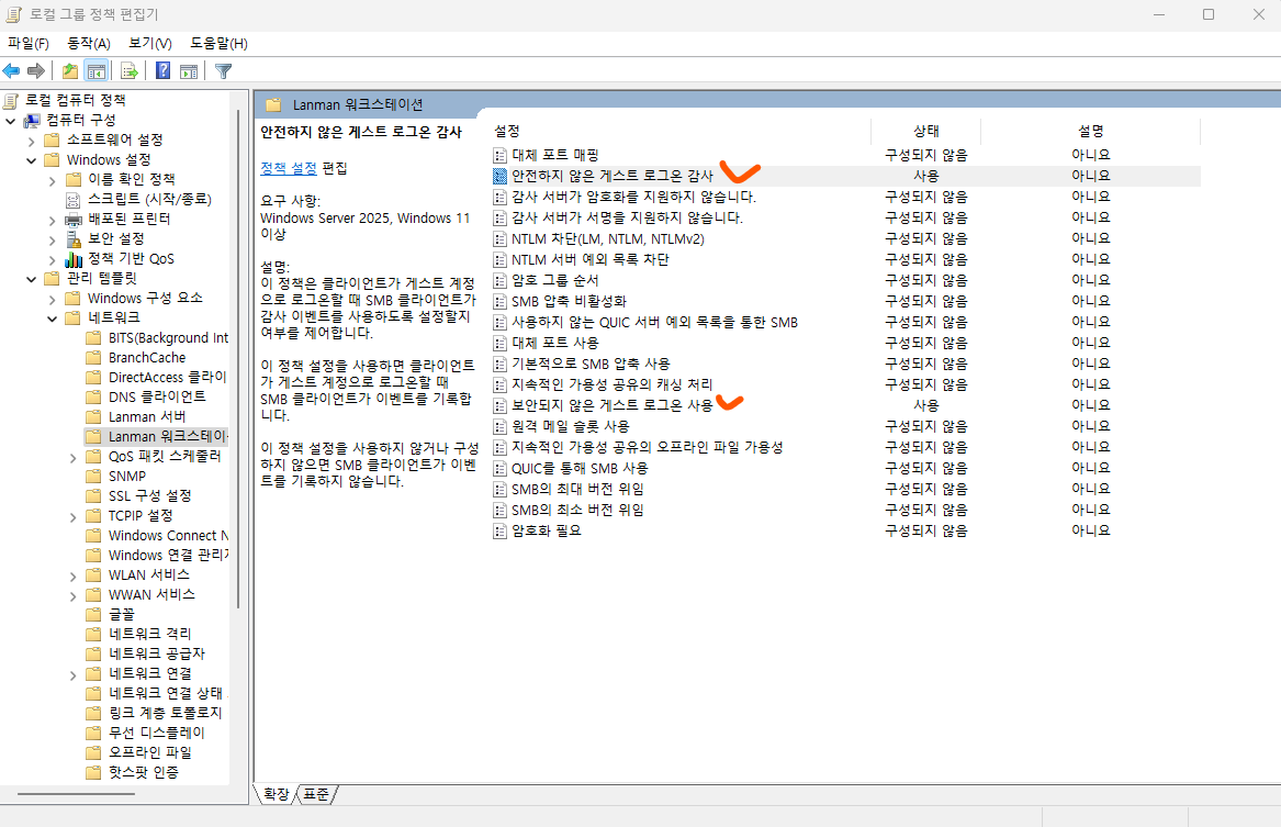 로컬 그룹 정책 편집기에서 컴퓨터 구성 → 관리 템플릿 → 네트워크 → Lanman 워크스테이션 으로 이동